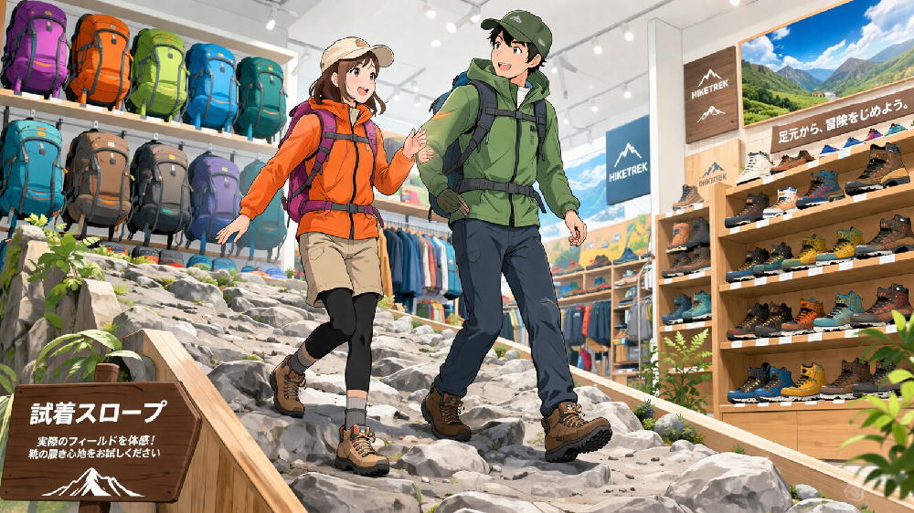 平地で快適でも、坂道では感覚が変わります。 店内の試し履き用スロープで、登りでは「かかとがズレないか」、下りでは「つま先が当たらないか」を念入りにチェックしてください。少しでも「当たる」感覚があれば、それは山では激痛に変わります。